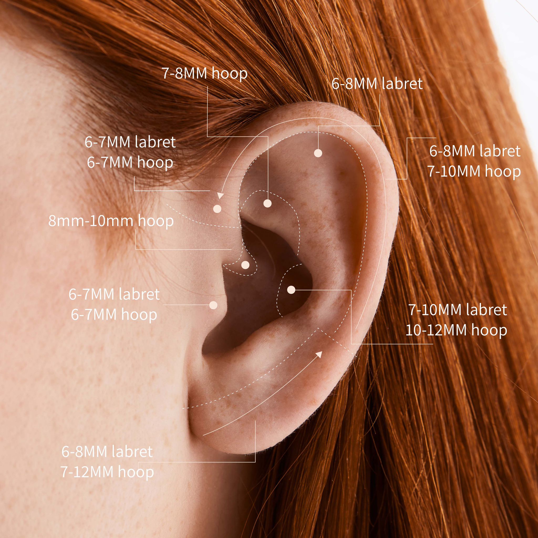 In the image above, we’ve highlighted which earring style is best for the different piercing placements and the ideal lengths. Once you’ve decided which piercing you want, you can refer to this image to help pick out your perfect earrings!